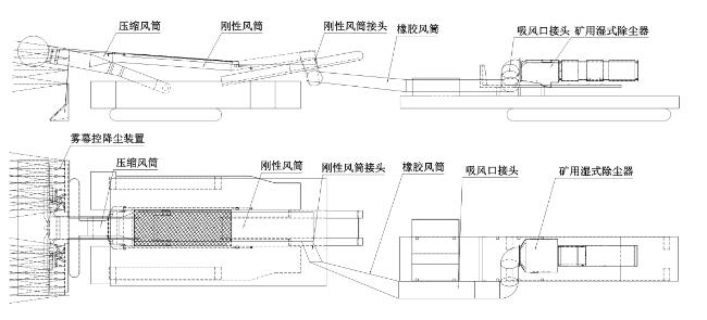 中國煤科重慶研究院針對上述問(wèn)題創(chuàng )新性提出了一種“前方掘錨機布置吸塵管道+后方自移機尾安設除塵器+中間柔性橡膠風(fēng)筒聯(lián)接”的除塵系統配套工藝,研制出一種風(fēng)機后置式濕式除塵器,它適用于巖性粉塵特性的高效處理,處理風(fēng)量可達650m3/min。此外,還配合環(huán)形外噴霧源頭降塵、附壁風(fēng)筒分風(fēng)控塵等措施。最終,將低矮半煤巖掘錨工作面的呼吸性粉塵濃度降塵效率由原來(lái)的45.3%提高至87.6%以上,迎頭作業(yè)區域能見(jiàn)度提升至20m以上,作業(yè)區域環(huán)境得到顯著(zhù)改善。