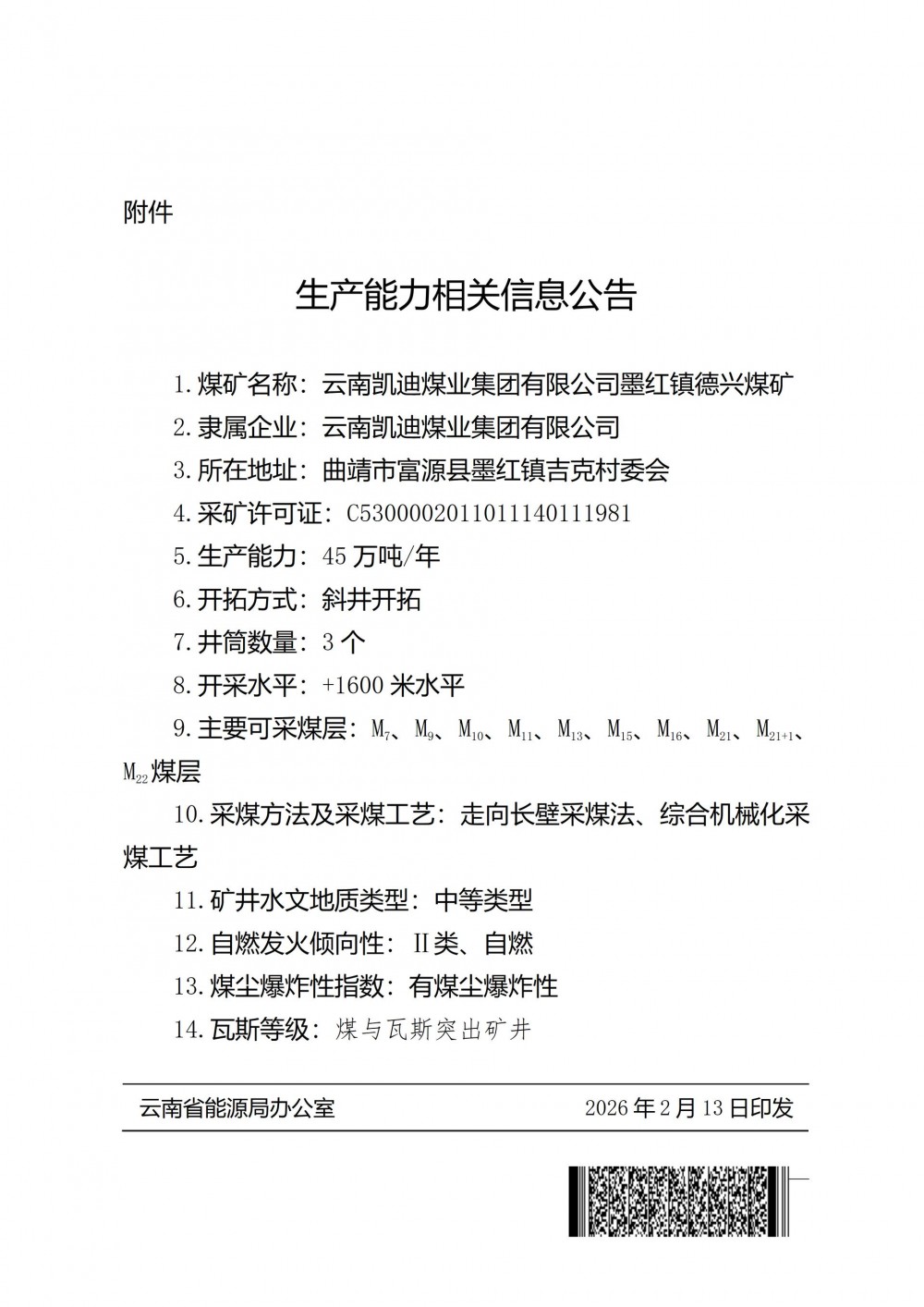 《曲靖市能源局關(guān)于上報(bào)德興煤礦45萬噸/年建設(shè)項(xiàng)目生產(chǎn)能力確認(rèn)的請(qǐng)示》(曲能源請(qǐng)〔2026〕14號(hào))收悉。按照《應(yīng)急管理部 國(guó)家礦山安監(jiān)局 國(guó)家發(fā)展改革委 國(guó)家能源局關(guān)于印發(fā)煤礦生產(chǎn)能力管理辦法和核定標(biāo)準(zhǔn)的通知》(應(yīng)急〔2021〕30號(hào))、《國(guó)家能源局關(guān)于建立煤礦生產(chǎn)能力登記和公告制度的通知》(國(guó)能煤炭〔2013〕476號(hào))、《云南省能源局關(guān)于做好煤礦生產(chǎn)能力確認(rèn)工作的通知》等有關(guān)規(guī)定和要求,現(xiàn)就確認(rèn)結(jié)果通知如下: